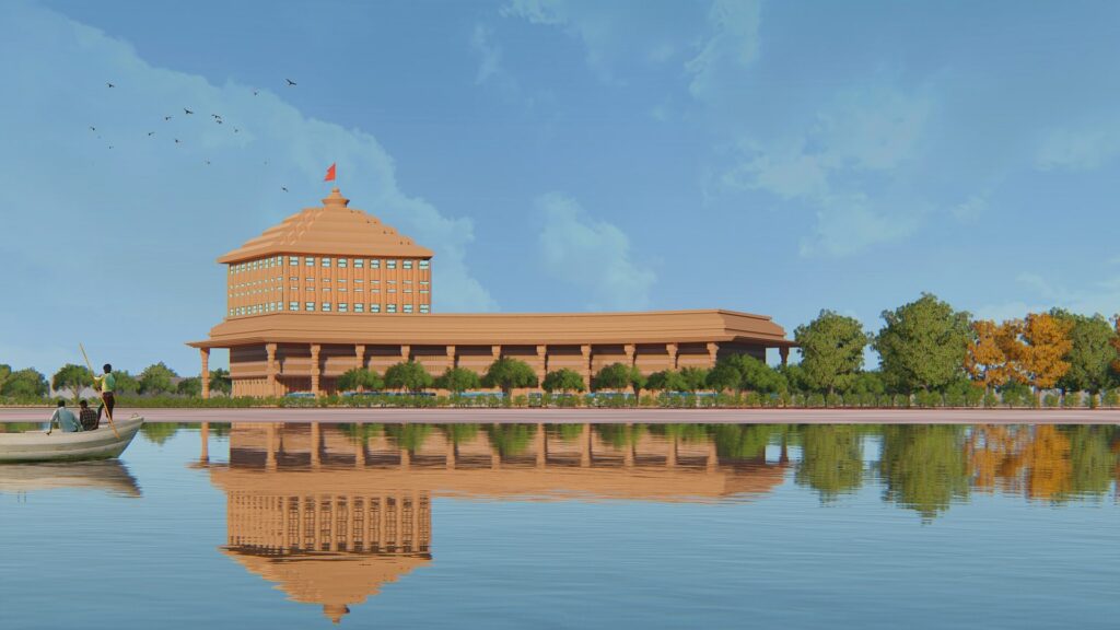 Ram Dwars, Gateways to Ayodhya, Six monumental Ram Dwars have been proposed as ceremonial entry points, featuring tourist accommodations, multi-level parking, and seamless access to net-zero electric vehicles. The Dwar designs being embellished with traditional stone facades aims to create a grand and inviting entrance to the city, symbolizing the inclusive spirit that welcomes everyone to this revered destination, irrespective of their social status or wealth. Additionally, Ayodhya’s redevelopment emphasizes renewable energy, waste management, and water sustainability. Restoration of 108 kunds and the Sarayu River Edge Development are central ecological efforts. Ayodhya is known for its 108 historically significant kunds or small lakes, including the Bharat Kund and Surya Kund, that are undergoing an ambitious restoration effort. The revival of Sarayu River aims to transcend its role as a mere water channel. The Sarayu River Edge Development has been envisioned as a vibrant public space, enhancing the city’s communal landscape and offering residents and visitors alike a serene and inviting environment. Ayodhya’s growth promotes MSMEs, homestays, dharamshalas, cultural tourism, and educational initiatives rooted in Shri Ram’s teachings.