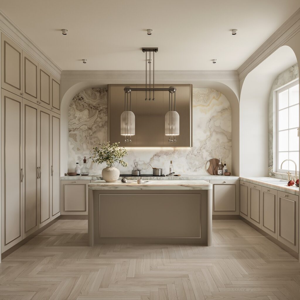 Crafted entirely from premium stainless steel in a subtle beige finish, the Symphony Kitchen combines durability with elegance. Veined marble flows across countertops and backsplashes like a lyrical refrain, mirroring the soft rhythm of everyday life. Brushed metal accents and traditional mouldings add a subtle sophistication to the space, while integrated appliances keep the kitchen highly functional and timelessly appealing.