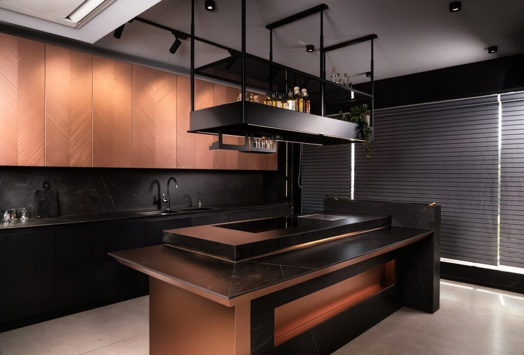 Among the kitchen displays is Odyssey, a captivating mix of matte black cabinetry, copper-toned accents and high-contrast details that exude drama and sophistication. Its chevron patterned upper cabinets finished in the brand’s signature Oxys texture add a refined edge to the design, while a sleek overhead chimney functions as a shelf for oils and indoor plants, merging practicality with aesthetic flair. Complete with smart automation, Odyssey is not just a kitchen but a striking future forward statement that balances functionality with unmistakable style.