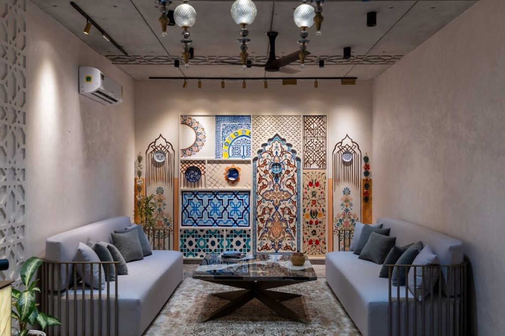 This residence embraces exposed concrete as a defining material, showcasing its raw elegance and structural integrity. The design seamlessly integrates Islamic architectural influences, reinterpreting traditional arches and intricate patterns in a contemporary context. Engraved ceiling patterns in exposed concrete add depth and refinement, while thoughtfully placed perforations and geometric motifs create a dynamic interplay of light and shadow, enhancing the spatial experience.
