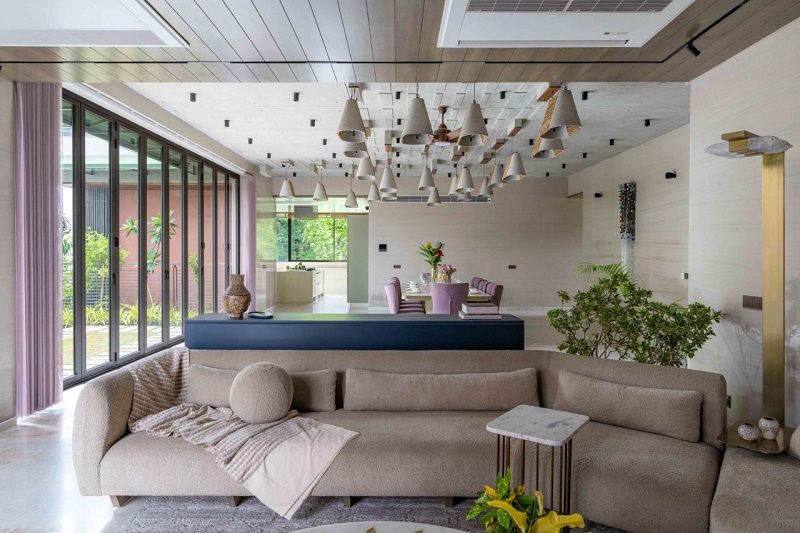 The design embodies a blend of intricate craftsmanship and modern innovation. Traditional carved elements are seamlessly integrated with an automated screen in the mandir, allowing the space to transform with the needs of the residents. Open layouts and interconnected volumes facilitate an effortless flow of movement, light, and air, ensuring that every corner of the home remains visually and spatially engaging.