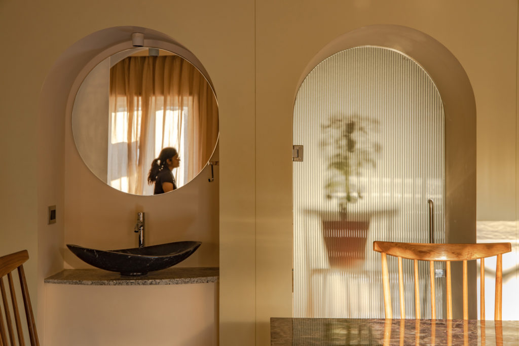 Each space of the house is designed uniquely and has its own characteristic of materials and tones, that cater to the user’s aesthetics and enhances the activity, by breathing life into the spaces. The house has a strongly defined central area of circulation which opens on both sides and acts as a threshold to the private areas. Three arches complement the core area to soften the character of the house, mellowing hues from one to another.